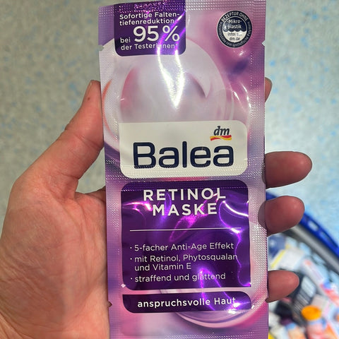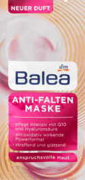 Balea 抗皺面膜內含有活躍的水分因子滋潤肌膚,有快速凍齡效果,有助於抵消老齡化和減少眼週肌膚自由基的跡象。緊緻肌膚皺紋,深度減少,帶抗氧化能力。